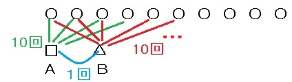 図のように増員した2名をA,BとするとAが既存のメンバと打合せを 10 回行い、 Bが既存のメンバと打合せを 10 回行う。さらに、AとBが、打合せを行うので、合計 21 回増える。