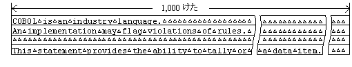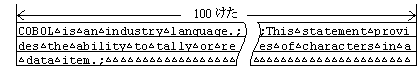 図1 文字列データの例(△ は空白を示す) (2) 入力ファイルの様式は,次のとおりである。 @ 1レコード 100 けたの固定長順ファイルである。 A 文字列データの長さが 100 の倍数でないとき,最後の段落のセミコロンの後ろには, 100けたになるように空白が埋められている。 (3) 出力ファイルの様式は,次のとおりである。 @ 1 レコード 1,000 けたの固定長順ファイルである。 A 1 レコードに 1段落が格納されている。 B 段落の終端文字であるセミコロンは出力しない。 C 段落が1レコードに満たないときは,後ろに空白を埋める。 (4) 図1の文字列データに対応する入力ファイル及び出力ファイルを図2,図3に示す。