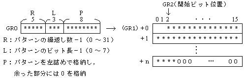 問13 CASL次のアセンブラプログラムの説明及びプログラムを読んで,設問1〜3に答えよ。 〔プログラムの説明〕 副プログラム EXPAND は,図1の形式で GR0 に与えられるパターン(ビット列)を, 指定された語( GR1 が指す語)の開始ビット位置( GR2 )以降の領域に展開し, 展開したビット列の長さを GR0 に設定するプログラムである。 指定された語の開始ビット位置までのデータは変更せず,最後の語の残りビットには 0 を入れる。
