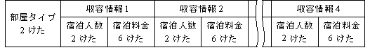 @ 宿泊人数:1 部屋に泊まる人数を示す。 A 宿泊料金:部屋の1人当たりの1泊料金を示す。 宿泊人数の違いによって 4 通り用意されている。 B 予約状況ファイルに格納されている部屋タイプに該当するレコードは,必ず存在する。 (3) 検索条件 SEARCH-INFO の形式は,次のとおりである。 検索条件で与えられるデータは正しいものとする。