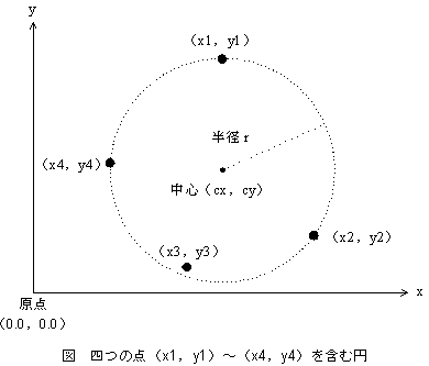 (1) 各点の位置は,x 座標と y 座標で与えられる。 各座標値はともに 104 を超えない正の値である。 (2) ここでは,次のアルゴリズムによって,求める円の中心を探し出している。 @ 仮中心点を原点(0.0,0.0)に,移動係数を 0.5 に設定する。 A n 個の点の中で,仮中心点から最も遠い位置にある点(最遠点)の方向に向かって,