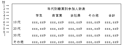 @ 各参加人数は,来場者アンケートを集計した結果で,総参加人数は最大6けたである。 A 年代別,職業別に参加人数を印字し,さらに年代別の合計を印字する。 B 参加人数及び合計人数以外の文字は,あらかじめ印字されている。 (3) アンケートファイルのレコードの各項目にエラーはない。