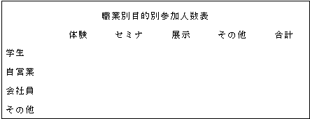 A 職業は,学生,自営業,会社員などに分類してコード化されており, 次のいずれかが記録されている。 1:学生, 2:自営業, 3:会社員, 4:その他 B 興味は,来場の主目的が,体験,セミナ,展示などのどれであるかを コード化したものであり,次のいずれかが記録されている。 1:体験, 2:セミナ, 3:展示, 4:その他 (2) 来場者アンケートを集計して,次の年代別職業別参加人数表を出力する。