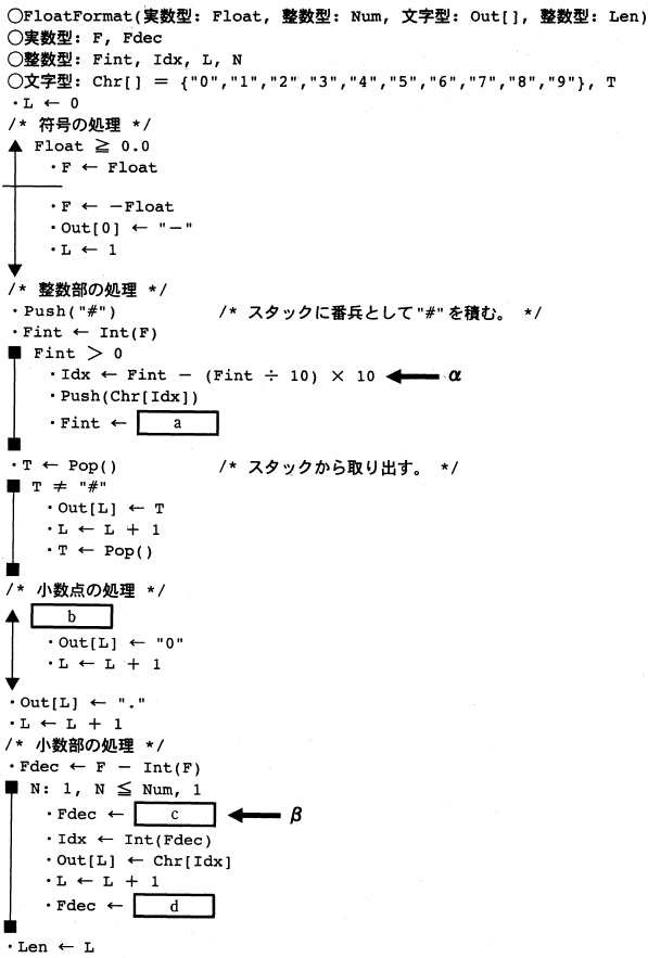 @ Float の値が負の場合は,負符号を表す"−"を Out[] に格納し,Float の値を正数に変換する。 (5) Push() はスタックに1文字を積む関数,Pop() はスタックから1文字を取り出す関数である。 Int() は小数点以下を切り捨てる関数である。 (6) 配列の添字は0から始まり,文字型配列 Out[] の要素数は十分に大きいものとする。 また,プログラム中の各演算であふれは発生しないものとする。 (7) FloatFormat の変換例を図に示す。