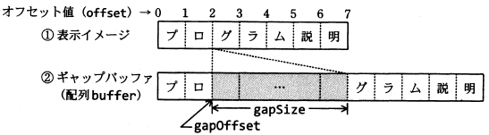 ![]() 図1 テキストの表示イメージとギャップバッファ クラス GapBuffer はギャップバッファの機能を実現する。このクラスの使用者は, テキストを仮想的に連続する文字列として扱うことができ,ギャップの位置やサイズを 意識せずに文字の挿入や削除の処理を行う。このとき, 図1@のように各文字はオフセット値(offset)で指定し, テキストの最初の文字はオフセット値0, テキストの最後の文字はオフセット値“テキストの文字数−1”で指定する。 図1Aは,配列 buffer 内におけるテキストの物理的な表現の例である。 フィールド gapOffSet と gapSize は,それぞれギャップの先頭位置とギャップのサイズを表す。 図1Aの状態から“プログラム”と“説明”の間に“の”を挿入する手順を図2に示す。