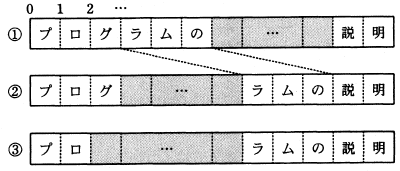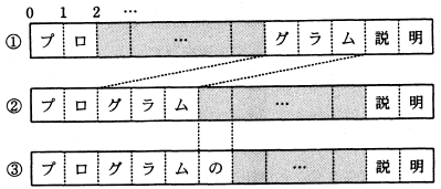 ![]() 図2 挿入する手順 まず,“プロ”の直後に“グラム”を移動することで,ギャップを“プログラム”と“説明”の間に 移動する(図2A)。ギャップの先頭に“の”を格納する(図2B)。 この操作によって,ギャップのサイズは1文字分小さくなり,ギャップの先頭位置は 1文字分後ろへずれる。 次に,図2Bの状態から“プログラムの”の“グ”を削除する手順を図3に示す。
