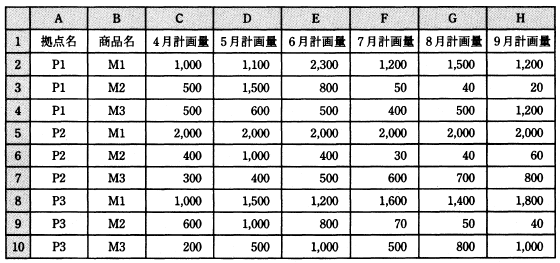 問13 表計算次の表計算及びワークシートの説明を読んで,設問に答えよ。 〔表計算の説明〕 E 社は,3種類の商品 M1 〜 M3 を自社で生産し,3か所の販売拠点 P1 〜 P3 で販売している。 販売する商品は,前月までに生産したものである。 (1) E 社では,各販売拠点で2月に立てた4〜9月の半年分の商品ごとの月別販売計画を基に, 次の@及びAに従って3〜8月の半年分の月別生産計画を作成している。 A 商品ごとに1か月間に生産できる最大の数量(以下,最大月産量という)が決まっているので, 前月にすべてを生産できない場合がある。その場合,不足分は前々月までに生産するように計画する。