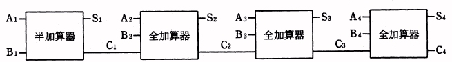 設問3 A,B 及び S を2の補数表現による4ビットの符号付2進整数とし,それぞれの ビット表現を A4A3A2A1, B4B3B2B1,及び S4S3S2S1で表す(符号ビットは A4,B4及び S4)。 図3は,A と B の加算を行い,結果を S に求める加算器であり,半加算器と全 加算器で実現されている。ここで,C1〜C4 とは半加算器及び全加算器からのけた 上がりを表す。 この加算器に,A として−1 を,B として−2(いずれも 10 進表記)を与えたとき, 図3のC1〜C4の値として正しい組合せを,解答群の中から選べ。