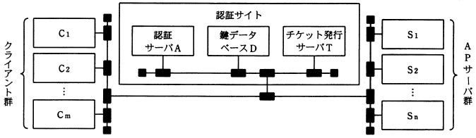 ![]() 図1 新認証システムの構成 〔新認証システムの構成と方式についての説明〕 (1) 新認証システムでは,共通鍵暗号方式によって,通信データを暗号化する。 以下,共通鍵を鍵という。 (2) 認証サイトは,認証サーバ,鍵データベース及びチケット発行サーバで構成する。 (3) チケット発行サーバの鍵は,チケット発行サーバ自体と鍵データベースに登録されている。 (4) 各 AP サーバの鍵は,それぞれの AP サーバ自体と鍵データベースに登録されている。 (5) 利用者の鍵は,利用者のパスワードから計算して決められ,鍵データベースに登録されている。 クライアントには,利用者が入力したパスワードから計算した鍵が, 利用者がクライアントの利用を終了するまで,一時的に保持される。 〔認証のための通信の例〕 図2は,利用者が,クライアント C から目的の AP サーバ S にアクセスする場合の認証の流れを示す。