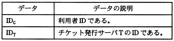 通信Bでは,クライアント C は,次のデータをチケット発行サーバ T に送信する。