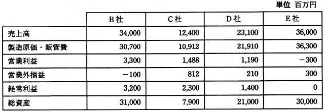 問07 5問選択子会社の業績評価に関する次の記述を読んで,設問1〜3に答えよ。 持株会社であるA社には,国内外に製造業を営む4社の子会社がある。 B社とC社は日本国内の子会社,D社はY国にある在外子会社,E社はZ国にある在外子会社である。 A社では,子会社の1年間の業績を評価して,業績の良好な子会社には経営優秀賞を 授与し,業績の落ち込んでいる子会社には要調査対象として詳細な経営分析を行っている。 経営優秀賞は,当該年度の営業利益と経常利益がともに黒字であり, かつ,前年度より売上高,営業利益率及び総資産利益率 ROA(Return on Assets)のすべてが 向上した子会社に授与される。 要調査対象は,当該年度の売上高と営業利益がともに前年度より 10% 以上減少した子会社である。 このたび,2009 年度の経営優秀賞と要調査対象の子会社を選出することになり, 決算用の資料を基に,子会社の 2008 年度と 2009 年度の業績を表1と表2にまとめた。 ここで,D社とE社の業績は日本円に換算して記されている。
