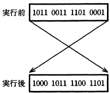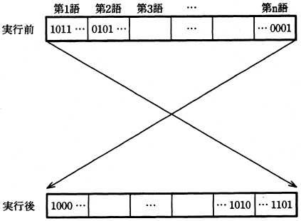 設問2 連続した n 語( n ≧ 1 )を 16 × n ビットのビット列とみなす。 副プログラム REVRS を利用して,このビット列のビットの並びを,図2に示すように逆転する 副プログラム LREVRS を作成した。 ![]() 図2 n 語のビット列のビットの並びを逆転 主プログラムから渡されるレジスタの内容は,次のとおりとする。