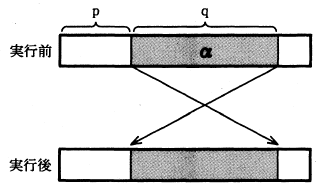 設問3 副プログラム REVRS を使用して,16 ビット(1語)からなるビット列中の 部分ビット列αのビットの並びを,図3に示すように逆転する副プログラム PREVRS を作成した。p,q は,それぞれ部分ビット列の直前までのビット数及び 部分ビット列のビット数を表す。 ここで,p ≧ 0,q > 1,p + q ≦ 16 とする。 ![]() 図3 部分ビット列αのビットの並びを逆転 主プログラムから渡されるレジスタの内容は,次のとおりとする。 GR2: p GR3: q