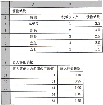 図1 ワークシート“役職給” 役職をセル A2 〜 A6 に,役職の序列を示す数値である役職ランクをセル B2 〜 B6 に, 役職給をセル C2 〜 C6 に入力する。 〔ワークシート:賞与係数〕 賞与の計算の基となる役職ごとの役職係数及び個人評価点に対応した個人評価係数を 登録した図2のワークシート“賞与係数”を作成した。