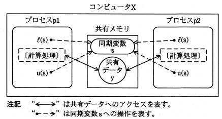 ![]() 図2 同期変数 s を用いた排他制御
