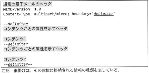 ![]() 図1 二つのコンテンツを格納した MIME 形式のメッセージ boundary="delimiter" の delimiter には, 格納したコンテンツの区切りを示す文字列を指定する。 delimiter の先頭に“--”を付けたものが1つのコンテンツの開始を示し, delimiterを“--”で囲ったものが最後のコンテンツの終了を示す。 delimiter には,コンテンツに含まれる行が,誤ってコンテンツの区切りと 認識されることのないような文字列を,選択しなければならない。 “コンテンツごとの属性を示すヘッダ”には,テキストや画像などのコンテン ツの種類や,エンコードの方式などを指定する。エンコードの方式には“base64”や “quoted-printable”のほか,コンテンツがエンコードされていない 7ビット符号のテキストであることを示す“7bit”などが指定できる。 図1中の“コンテンツ1”が7ビット符号のテキストであって,図2に示す3 行をコンテンツに含むとき,delimiter としてふさわしくない文字列を, 解答群の中から三つ選べ。