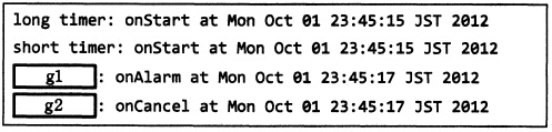 メソッド onAlarm 及び onCancel で,このオーバロードしたメソッド log を