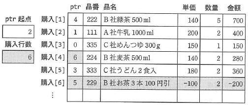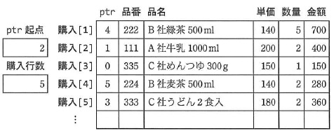 A 購入[] には,購入する商品の情報が,バーコードを読み込んだ順に添字1の 要素から格納されている。同一品番の商品の情報は,1レコードにまとめられており, 品番の重複はない。 B 購入[] 中の ptr は,レコードを品番の昇順にたどるポインタであり, 次に大きい品番をもつレコードが格納されている要素の添字が入っている。 最も大きい品番をもつレコードの ptr 値は0である。 C ptr 起点 は,最も小さい品番をもつレコードが格納されている 購入[] の 要素の添字を示す。 D 購入行数 は,購入[] 中に格納されたレコード件数を示す。 (3) 特売情報の内容は,次のとおりである。