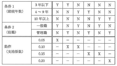 図1 従業員ファイルのレコード様式 @ 役職には,一般職の場合は0,管理職の場合は1を格納する。 A 入社日には,入社した年,月,日を,それぞれ4桁,2桁,2桁の西暦で格納する。 表1に示す支給係数の決定表の条件1(勤続年数)は,入社日から 2013 年4月1日までの 経過年数とする。例えば,入社日が 2012 年4月1日の場合は1年であり, 2012 年4月2日の場合は0年である。