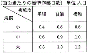 問54 作業工数の計算全部で 100 画面から構成されるシステムの画面作成作業において,規模が小かつ複雑度が単純な画面が 30, 中規模かつ普通の画面が 40,大規模かつ普通の画面が 20,大規模かつ複雑な画面が 10 である場合の工数を, 表の標準作業日数を用いて標準タスク法で見積もると何人日になるか。ここで, 全部の画面のレビューに5人日を要し,作業の管理に,レビューを含めた作業工数の 20 %を要するものとする。