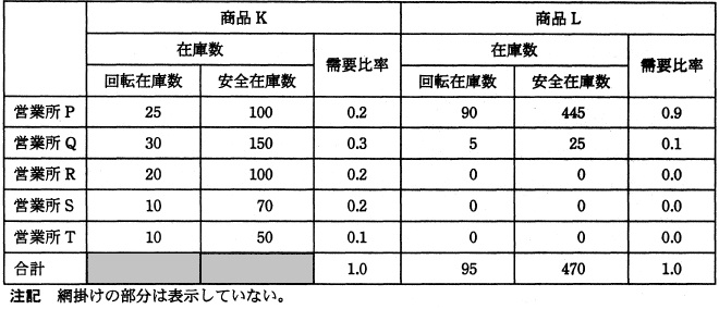 設問3 A社では,業務改善と販売管理システムの改修に先立ち, 商品 K と商品 L を対象にして,物流倉庫に集約して一元管理することによる 在庫数の削減効果を評価することにした。削減効果に関する次の記述中の に入れる正しい答えを,