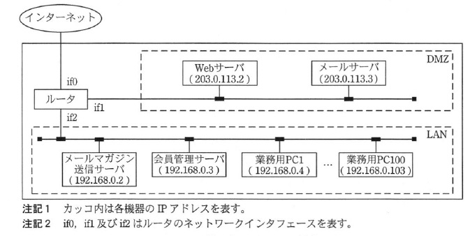 問01 必須問題問1 ネットワークセキュリティに関する次の記述を読んで,設問1〜4に答えよ。 A社は,社内に設置した Web サーバ上に,自社の製品を紹介する Web サイトを構築し, 運営している。A社は,この Web サイトで会員登録を受け付け,登録された会員に 対してメールマガジンを発行している。 A社のネットワーク構成を,図1に示す。