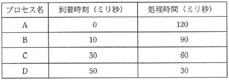 プロセスの実行順序を決定する別の方式に残余処理時間順方式がある。 残余処理時間順方式は,一定の時間ごとに実行状態と実行可能状態にある プロセスの残余処理時間を比較し,その時間が最も短いプロセスに CPU を 割り当てる方式である。ここで,残余処理時間とは,プロセスの残りの処理が 完了するまでに必要な CPU の割当時間である。 表1に示すプロセス A 〜 D を,残余処理時間順方式で実行した場合の ターンアラウンドタイムについて考える。ターンアラウンドタイムとは, プロセスが最初に待ち行列に登録されてから処理が完了するまでの時間である。 プロセス A が登録されてから 10 ミリ秒ごとに残余処理時間を比較しながら 実行したとき,プロセス A,B,C のターンアラウンドタイムはそれぞれ ミリ秒, ミリ秒,