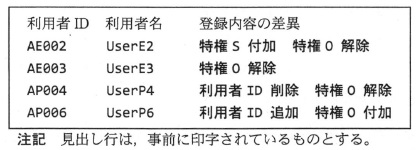 A 属性は,次に示す内容の8ビット長のビット列 ビット s : 特権 S が付加されていれば 1,付加されていなければ 0 ビット o : 特権 0 が付加されていれば 1,付加されていなければ 0 ビット g 及び r : その他の属性 B 最終使用日は,数字から成る文字列で,その利用者 ID で最後にログインした 年月日を表す。登録後,一度もログインしていない場合は,全桁が“0”である。 (3) 利用者 ID 及び特権の登録内容の差異は,次のように印字する。 利用者 ID,利用者名の後に“利用者 ID 追加”と印字する。この利用者 ID に 特権 S が付加されていれば“特権 S 付加”,特権 0 が付加されていれば“特権 0 付加” 追加印字する。 A OldFile 中にあって NewFile 中にない利用者 ID の場合 利用者 ID ,利用者名の後に“利用者 ID 削除”と印字する。この利用者 ID に 特権 S が付加されていれば“特権 S 解除”,特権 0 が付加されていれば“特権 0 解除”を 追加印字する。 B NewFile 及び OldFile の両方にあり,特権 S と特権 0 の少なくとも一方の付加状況が 変わった利用者 ID の場合 利用者 ID ,利用者名の後に“特権 S 付加”,“特権 S 解除”, “特権 0 付加”,“特権 0 解除”の該当する全てを印字する。 (4) 入力ファイル NewFile 及び OldFile のデータ例を図1に,図1のデータ例を 用いた実行結果を図2に,それぞれ示す。