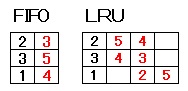 問19 仮想記憶方式仮想記憶方式のコンピュータにおいて,実記憶に割り当てられるページ数は3とし, 追い出すページを選ぶアルゴリズムは,FIFO と LRU の二つを考える。 あるタスクのページアクセス順序が 1, 3, 2, 1, 4, 5, 2, 3, 4, 5 のとき,ページを置き換える回数の組合せとして適切なものはどれか。