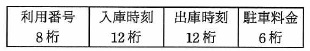 次の COBOL プログラムの説明及びプログラムを読んで,設問1〜3に答えよ。 〔プログラムの説明〕 ある駐車場では,自動精算システムを導入している。利用者は,入庫時に利用番号と 入庫時刻が記録された駐車券を受け取り,出庫時に駐車券を精算機に投入して駐車料金を支払う。 連続した複数日にまたがる駐車も可能である。プログラム1は入庫時に入庫時刻を精算ファイルに 記録するサブプログラムであり,プログラム2は出庫時に駐車料金を計算して出庫時刻とともに 精算ファイルに記録し,駐車料金の値を呼出し元に返すサブプログラムである。 (1) 精算ファイルは,図1に示すレコード様式の索引ファイルであり, プログラムの実行時に既に存在する。主キーは利用番号である。 ファイルの排他制御は適切に行われるものとする。