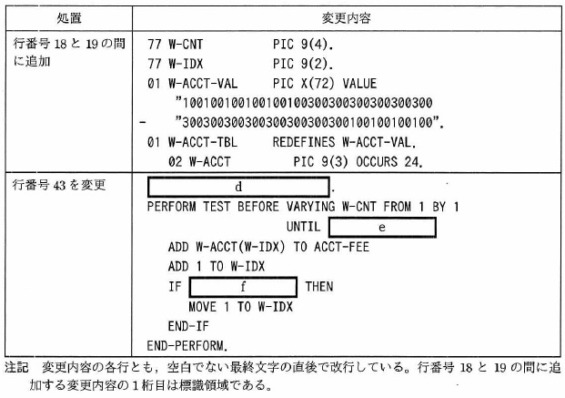 ![]() d に関する解答群 ウ MOVE 1 TO W-IDX エ MOVE ACCT-I-HH TO W-IDX e,f に関する解答群 ウ W-HRS = W-IDX エ W-IDX = 24 オ W-IDX = W-CNT カ W-IDX > 24