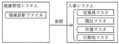 〔健康管理システム及び人事システムの関係の説明〕 健康管理システムは,健康診断結果を健康診断ファイルで管理し,従業員の情報に ついては,必要な項目の最新情報を人事システムの各マスタを参照して利用する。 健康管理システム及び人事システムの関係は,図1のとおりである。