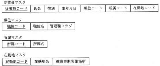 健康診断内容決定機能において,定期健康診断対象者抽出機能で従業員マスタから 抽出された情報に加えて,定期健康診断の健康診断コース及び健康診断実施場所を 決定するために最低限必要となるのは,a の情報である。 再検査対象者抽出機能で健康診断ファイルから抽出された情報に加えて, 再検査の健康診断実施場所を決定するために最低限必要となるのは,b の情報である。 a,b に関する解答群 イ 従業員マスタ及び職位マスタ ウ 従業員マスタ及び在勤地マスタ エ 従業員マスタ,職位マスタ及び在勤地マスタ オ 職位マスタ カ 職位マスタ及び所属マスタ キ 職位マスタ及び在勤地マスタ ク 所属マスタ ケ 所属マスタ及び在勤地マスタ コ 在勤地マスタ