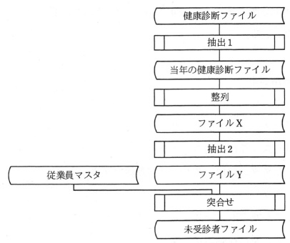 今回,健康管理業務として,12 月の受診者の健康診断の判定結果を登録した後に, 当年の健康診断の未受診者を抽出することになった。そのために,未受診者抽出機能を追加することにした。 ここで,当年の健康診断の未受診者は,従業員マスタから情報が抽出できる従業員のうち, 次のいずれかに該当する者とする。 (1) 当年の定期健康診断の健康診断レコードが存在しない。 (2) 当年の定期健康診断の判定結果が登録されていない。 (3) 当年の定期健康診断の結果,再検査が必要と判定されたが, 再検査の健康診断レコードが存在しない,又はその判定結果が登録されていない。 未受診者抽出機能の処理の流れを図4に示す。ここで,図4の従業員マスタは 従業員コードの昇順で整列されているものとする。