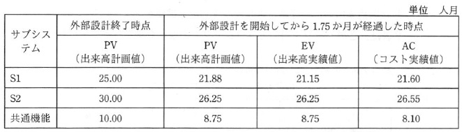 外部設計を開始してから 35 作業日(1.75 か月)が経過した時点での, 外部設計工程のサブシステムごとの EVM 指標値を,表5に示す。ここで, 表5の EVM 指標値は,小数点第3位を四捨五入した値である。