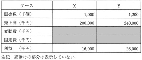 利益計画を策定するために,部品 T の販売数について2通りの検討を行った。 表1は,部品 T の販売数を 1,000 千個見込むケース X と, 1,200 千個見込むケース Y についての収益検討表である。両ケースの, 売上高に対する変動費の比率(以下,変動費率という)は等しく,固定費は同額である。