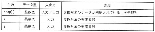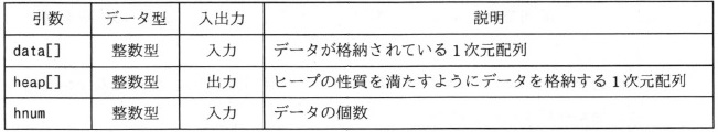 ![]() 図2 図1のヒープの例に対応した配列 heap の内容 (4) 親の要素番号と子の要素番号を関係付ける三つの関数がある。 要素番号 i の配列要素に対応する節の左側の子の配列要素の要素番号 2×i+1 を計算して返却する。 A 整数型:rchild(整数型:i ) 要素番号 i の配列要素に対応する節の右側の子の配列要素の要素番号 2×i+2 を計算して返却する。 B 整数型:parent(整数型:i ) 要素番号 i の配列要素に対応する節の親の配列要素の要素番号(i−1)÷2(小数点以下切捨て)を計算して返却する。 (6) 副プログラム makeHeap の引数の仕様を表1に,副プログラム swap の引数の仕様を表2に示す。