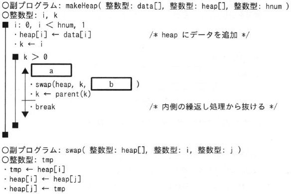 a に関する解答群 ウ heap[k] > heap[rchild(k)] エ heap[k] < heap[lchild(k)] オ heap[k] < heap[parent(k)] カ heap[k] < heap[rchild(k)] b に関する解答群 ウ parent(hnum−1) エ parent(k)