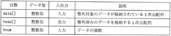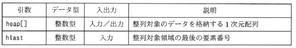 ![]() 図3 配列 heap における整列対象領域と整列済みデータ領域 (2) 整列対象領域がヒープの性質を満たすとき,配列要素 heap[Ø] の値は, この領域での最大の値となっている。そこで,配列要素 heap[Ø] の値と 配列要素 heap[last] の値を交換し,last の値を 1 減らして, 整列対象領域の範囲を狭め,整列済みデータ領域を広げる。値の交換によって, 整列対象領域はヒープの性質を満たさなくなるので,副プログラム downHeap を使って, 整列対象領域のデータがヒープの性質を満たすように再構成する。 これを繰り返すことによって,整列済みデータ領域には昇順に整列されたデータが 格納されることになる。 (3) 副プログラム heapSort の引数の仕様を表3に,副プログラム heapSort で 使用する副プログラム downHeap の引数の仕様を表4に示す。