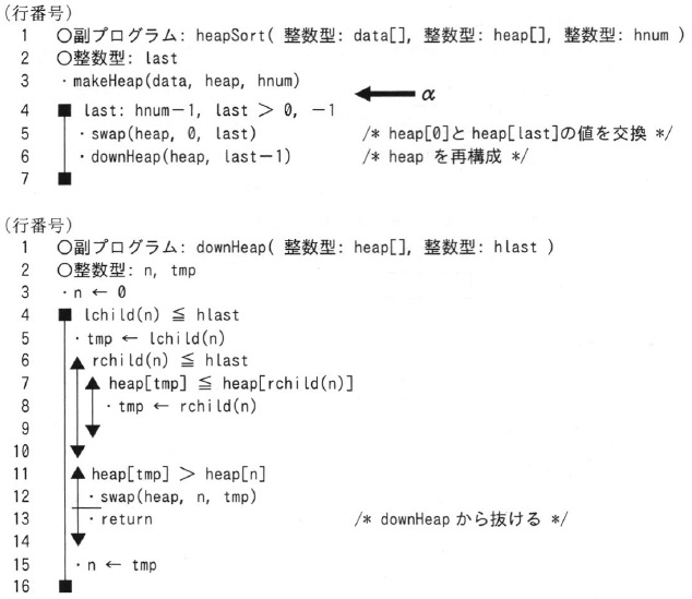 ![]() 図1 ヒープの例 〔プログラム1の説明〕 (1) 配列の要素番号は,Ø から始まる。 (2) 副プログラム makeHeap は,整数型の1次元配列 data に格納されている hnum 個 (hnum > 0)のデータを,次の@〜Bの規則で整数型の1次元配列 heap に格納して, ヒープを配列で実現する。この状態を,“配列 heap は,ヒープの性質を満たしている”という。