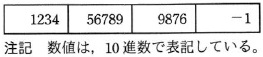 ![]() 図2 文字列の例 (2) 管理テーブルには,文字列中に数字列が現れるごとに,順に 1 語から成る要素を追加し, 数字列を数値に変換して得た値を格納する。数字列の探索が終了したとき, 管理テーブルの最後に 1 語から成る要素を追加し,数値の終わりを示す印として −1 を格納する。 図2の文字列を GETWD で処理して得た管理テーブルを,図3に示す。