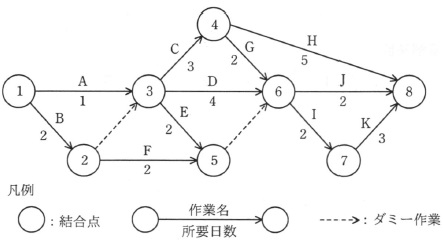 ![]() 図2 作成途中のアローダイアグラム 作成途中のアローダイアグラムには,二つのダミー作業が欠けている。 りん議書電子化プロジェクトのスケジュールを正しく表現するためには, e と f にダミー作業を追加する必要がある。 ダミー作業追加後のアローダイアグラムにおいて,りん議書電子化プロジェクトの総所要日数は, g 日である。 e,f に関する解答群 ウ 結合点 4 から結合点 5 エ 結合点 4 から結合点 6 オ 結合点 6 から結合点 7 カ 結合点 6 から結合点 8 キ 結合点 6 から結合点 12 ク 結合点 7 から結合点 9