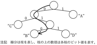 A 文字の出現回数表に基づいて,各文字に対応する葉の値を,配列の先頭の要素から順に格納する。 B 親が作成されていない節を二つ選択し,選択した順に左側の子,右側の子とする親の節を一つ作成する。 この節の値を,配列中で値が格納されている最後の要素の次の要素に格納する。 節の選択は節の値の小さい順に行い,同じ値をもつ節が二つ以上ある場合は, 配列の先頭に近い要素に値が格納されている節を選択する。 C 親が作成されていない節が一つになるまでBを繰り返す。 (3) ハフマン木から文字のビット列(以下,ビット表現という)を次の手順で作成する。 A 文字ごとに根から対応する葉までたどったとき,枝のビット値を順に左から 並べたものを各文字のビット表現とする。 図2に示すとおり,根から矢印のようにたどると,文字列αの文字“B”のビット表現は 010 となる。