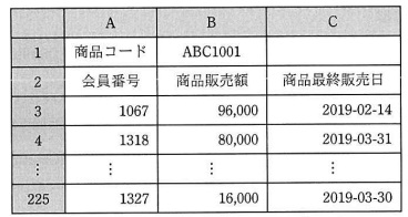問13 表計算次の表計算のワークシート及びマクロの説明を読んで,設問1,2に答えよ。 〔表計算の説明〕 小売販売の Z 店では,会員として登録した顧客に会員カードを発行して販売促進活動に利用している。 このたび,会員への 2018 年 10 月1日から 2019 年3月 31 日までの期間(以下,対象期間という)の 販売データを基に,販売促進キャンペーンを実施することにした。 〔ワークシート:販売データ〕 ワークシート“販売データ”には,対象期間における会員への販売データが, 販売日の昇順で格納されている。ワークシート“販売データ”の例を,図1に示す。