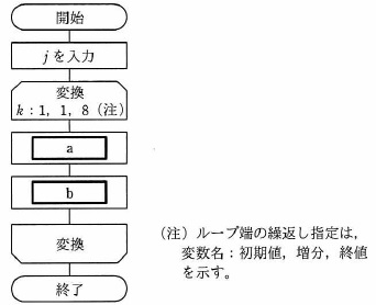 問01 10進整数を2進数に変換次の流れ図は,10 進整数 j (0 < j < 100)を8桁の2進数に 変換する処理を表している。 2進数は下位桁から順に,配列の要素 NISHIN(1) から NISHIN(8) に格納される。 流れ図の a 及び b に入る処理はどれか。 ここで, j div 2 は j を2で割った商の整数部分を, j mod 2 は j を2で割った余りを表す。 ![]()