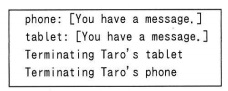 次の Java プログラムの説明及びプログラムを読んで,設問1,2に答えよ。 〔プログラムの説明〕 スマートフォンやタブレット端末といった携帯端末に通知メッセージを配信するシステム (以下,通知システムという)を模したプログラムである。この通知システムは, メール着信を通知するメッセージを非同期で携帯端末に配信する。このプログラムでは, 通知メッセージを配信する処理及び各携帯端末の処理を,それぞれ独立したスレッドとして実行する。 このプログラムは,次のインタフェース及びクラスから成る。 ここで,各コンストラクタ及びメソッドには,正しい引数が与えられるものとする。 (1) インタフェース NotificationListener は,通知メッセージを受け取るためのメソッドを定義する。 以下,NotificationListener のインスタンスをリスナという。 A メソッド send は,引数で指定された利用者名で登録されている各携帯端末に, 引数で指定された文字列を通知メッセージとして配信する。 携帯端末に対して未配信の通知メッセージがある場合, 引数のメッセージを未配信のメッセージリストに追加する。 B メソッド loopForMessages は,引数で指定された携帯端末に対して, 通知メッセージがあれば携帯端末のリスナに通知し,なければ通知メッセージを受け取れる状態 (以下,待ち受け状態という)にする。この処理を,通知システムが停止されるまで繰り返す。 C メソッド shutdown は,通知システムを停止する。未配信の全メッセージ, 全利用者名及び全携帯端末名の登録情報を削除し,登録されている全携帯端末の待ち受け状態を解除する。 A メソッド createUserMobileDevice は,利用者名とその携帯端末名を登録して, 通知メッセージを受信できる状態にする処理を,新しく生成したスレッドで実行する。 図1は,クラス Tester のメソッド main を実行して得られた出力の例である。 ここで,プログラムは,スレッドの実行速度及び事象発生に対する応答が十分速いシステムで 実行されるものとする。また,スレッドのスケジューリングによって,各行の出力順は異なることがある。