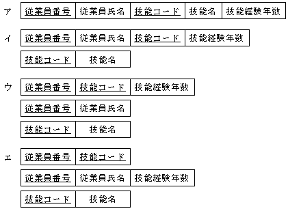 問67 第3正規形に正規化“技能記録”表を第3正規形に正規化したものはどれか。 ここで,下線部は主キーを表す。