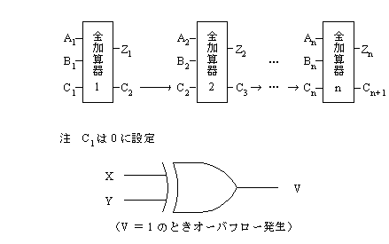 (2) けた上がりを考慮した2進数1けた同士の加算を行う全加算器の図と その真理値表を次に示す。
