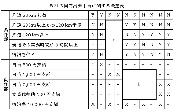 A 君は,B 社の出張管理システムにおいて, 国内出張手当の計算に関するモジュール設計を行っている。 B 社の1日当たりの国内出張手当(日当,食事代補助,宿泊費)の規定は,次のとおりである。 (1) 会社から出張先までの距離が片道 20 km 未満の場合には,日当 500 円を支給する。 (2) 会社から出張先までの距離が片道 20 km 以上かつ 120 km 未満の場合で, 現地での業務時間が8時間未満のときは,日当 1,000 円を支給する。 現地での業務時間が8時間以上であったときは,日当 1,000 円と食事代補助 500 円を支給する。 (3) 会社から出張先までの距離が片道 120 km 以上の場合で, 現地での業務時間が8時間未満のときは,日当 2,000 円を支給する。 現地での業務時間が8時間以上であったときは,日当 2,000 円と食事代補助 500 円を支給する。 (4) 宿泊を伴う出張の場合には,宿泊費として1泊につき 10,000 円を支給する。 次の表は,B社の規定をもとに作成した, 1日当たりの国内出張手当を算定するための決定表である。 ![]() 注 条件指定部での“Y”は条件が真,“N”は条件が偽,“-”は真偽に関係ないことを表す。 動作指定部での“X”は条件がすべて満たされたとき,その行で指定した動作の実行を表し, “-”は動作を実行しないことを表す。
