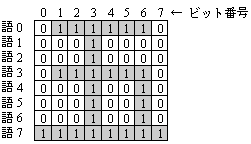 1語8ビットからなる連続する8語(ビット番号0が上位)を 8 × 8 のビット行列とみなすと,0と1のビットによって, 図1に示すように図形を描くことができる。